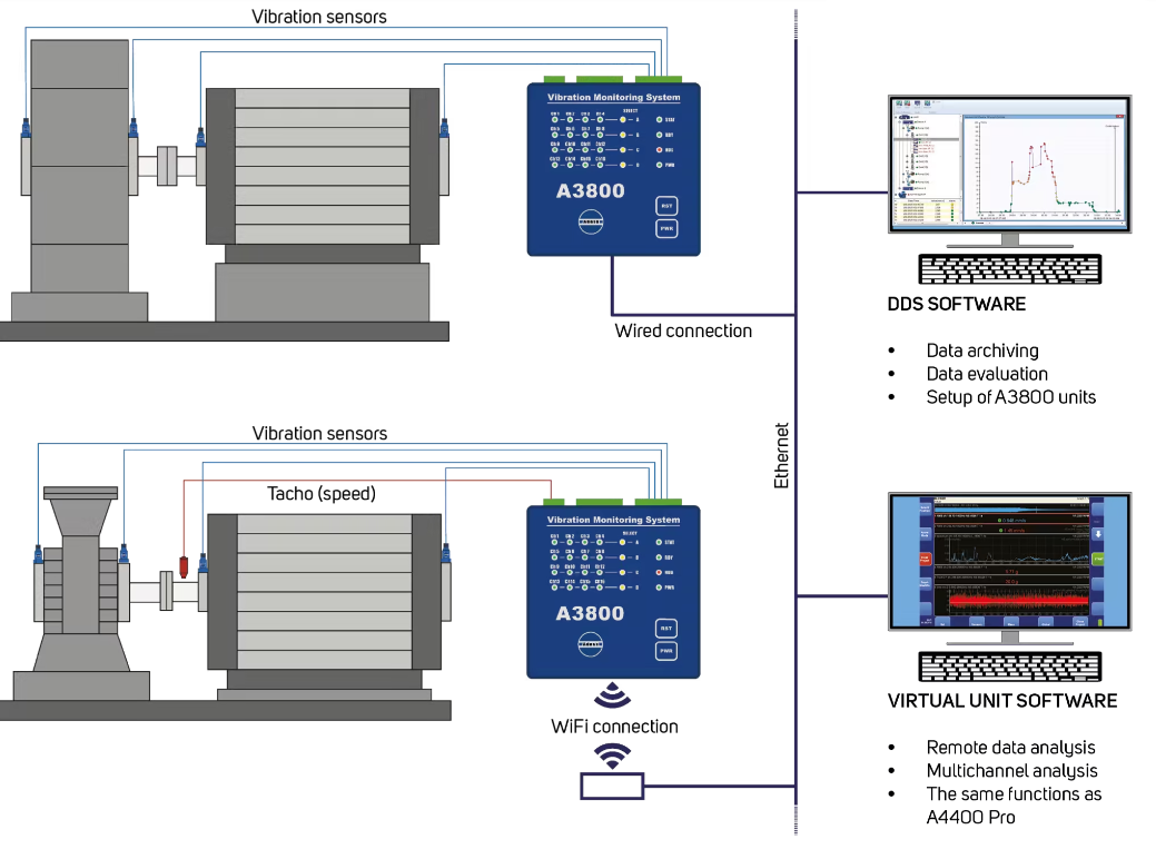 Sistema de monitoreo de vibración y protección de emergencia los cuales soportan los protocolos industriales SCADA, OPC, MODBUS con base de datos MS SQL y acceso remoto de base de datos.